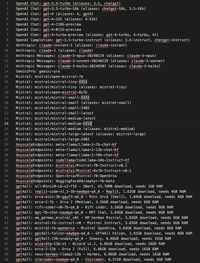 While I was at it, I connected Google Gemini, Anyscale Endpoints, and gpt4all, the latter providing the abovementioned 15 local models, which auto-install when you first request a model. 50 LLMs in all—and this is far from the complete list LLM provides access to through its plugin architecture.