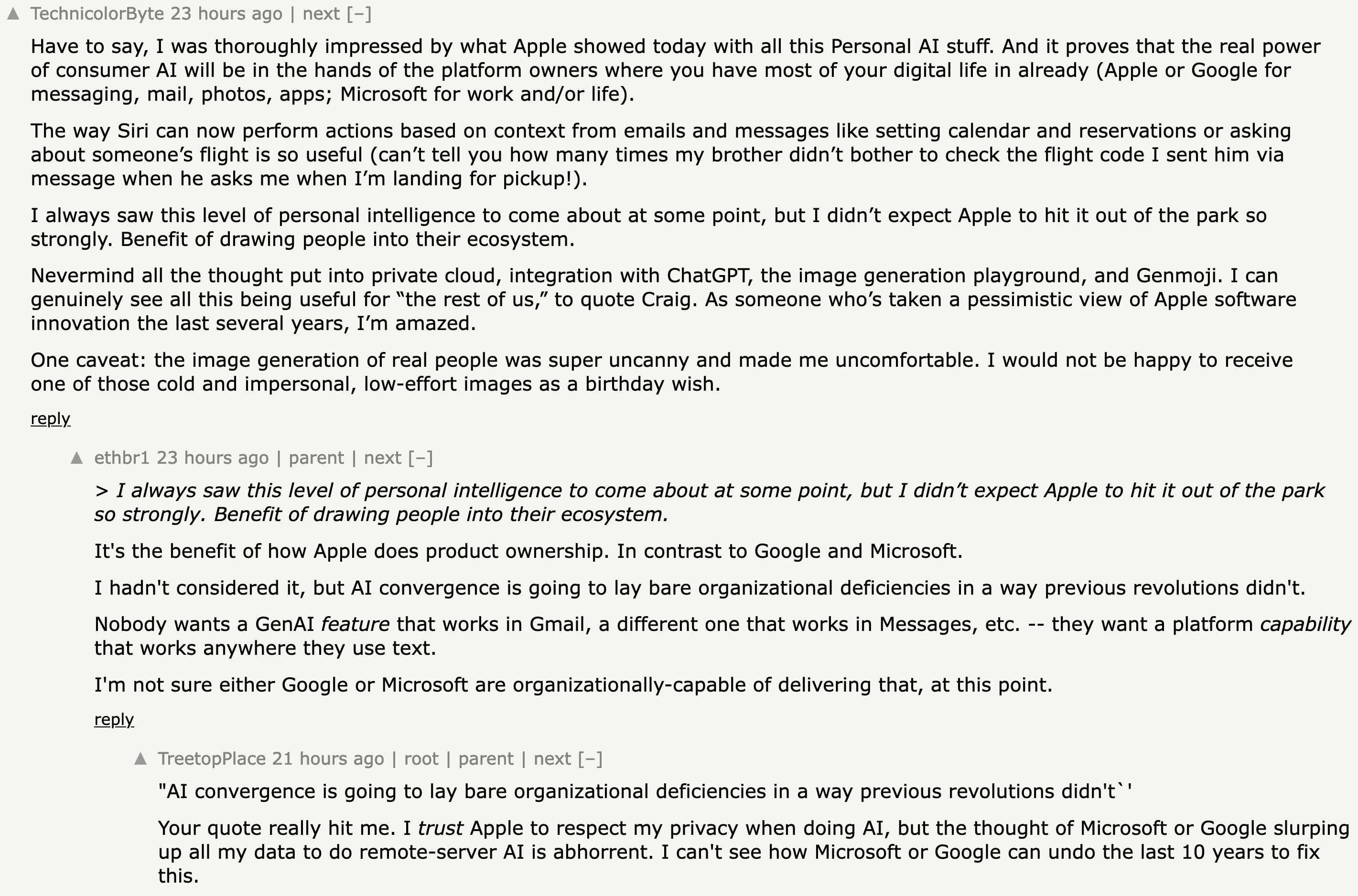 Over on Hacker News, the top of the Apple Intelligence for iPhone, iPad, and Mac comment thread was interesting: