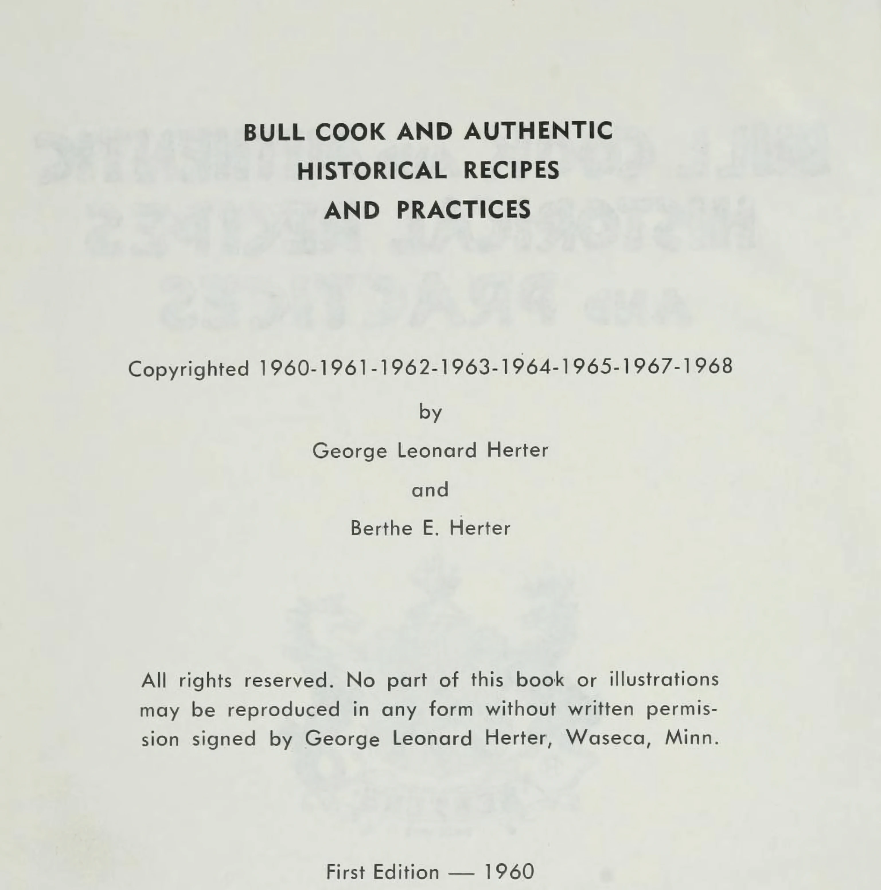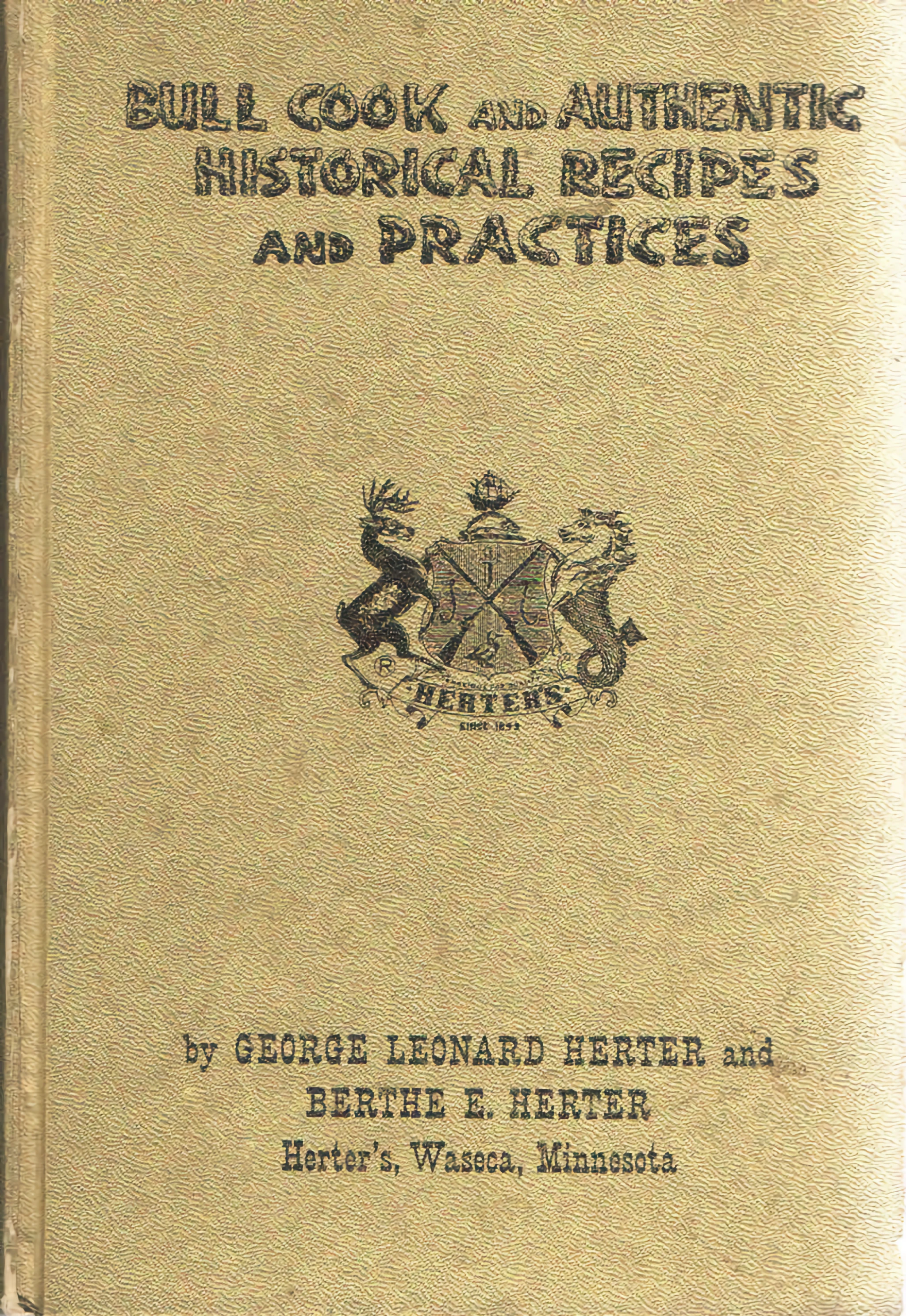 While browsing the lake house bookshelves, John stumbled across Bull Cook and Authentic Historical Recipes and Practices and was immediately hooked. And if you’re a creative cook who’s into Old Things, what’s not to love—it’s an insane collection of historical recipes and random factoids, itself written back in prehistoric 1960, with many recipes dating centuries further back. I can recall my father’s enthusiasm for the book, along with its author George Leonard Herter and his catalog business Herter’s.