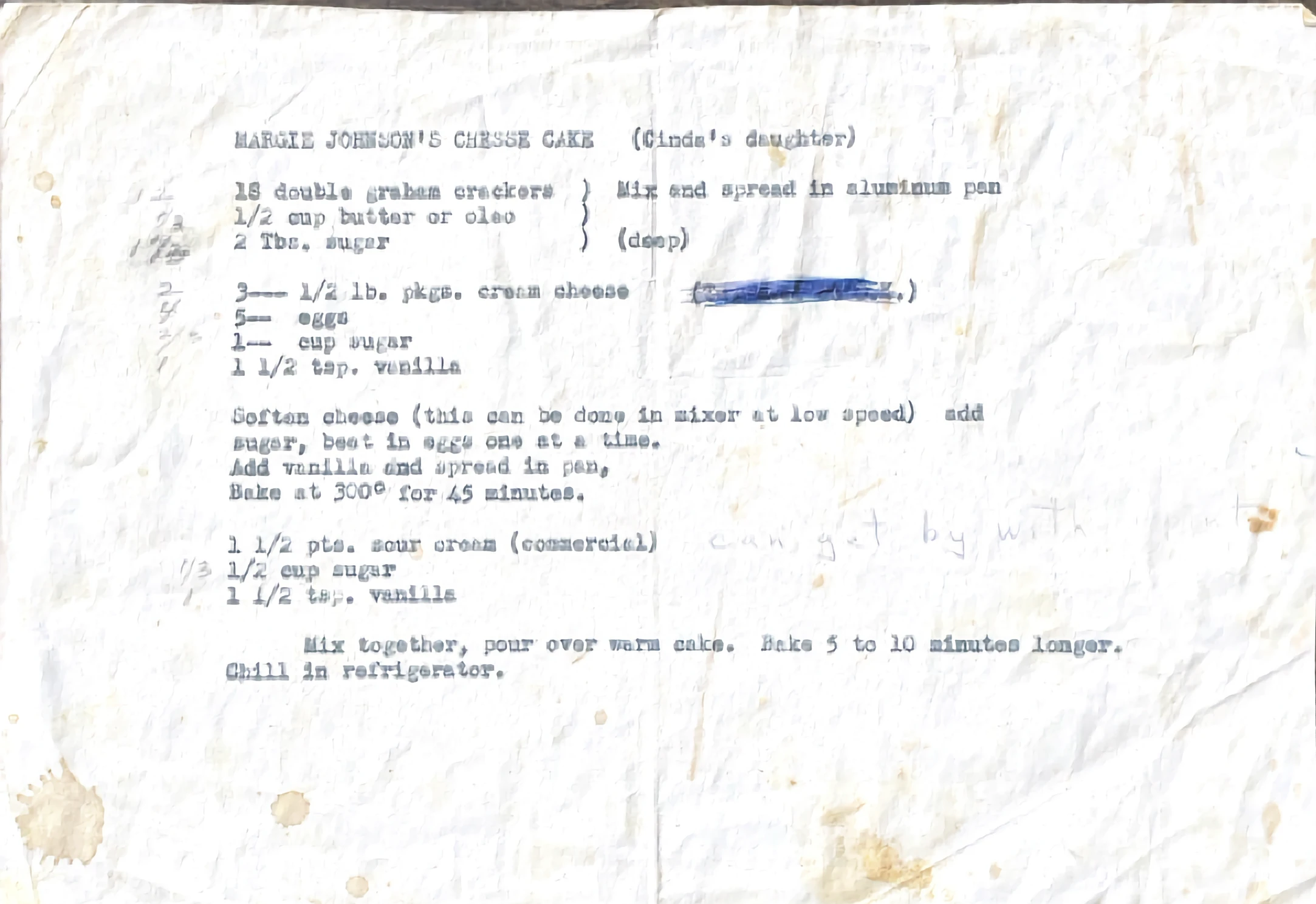 I fully expected an interesting failure. I’ve been doing technology for over four decades, which coincidentally is just about how long OCR—optical character recognition—has been available for personal use. And OCR has sucked for all of those decades. OCRing scans of printed documents is painful and error-prone. But with our legacy recipes, we faced much worse, like Margie Johnson’s Cheesecake above—typed with a worn ribbon, wrinkled, stained.