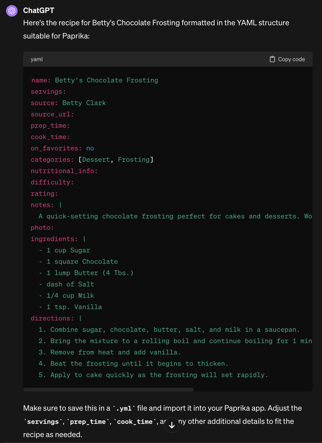 Despite the impressive gains compared with the time I would have spent manually transcribing or old-school OCRing, interactive-chatting my way through hundreds of recipes was going to be quite time-consuming. ChatGPT also has a tendency to “lose the thread” on long-running chats. Finally, though Paprika is capable of importing YAML files with an embedded BASE64 image, it was beyond ChatGPT’s capabilities to produce that kind of YAML output. As a result, I had to first import the generated YAML into Paprika, then manually add photos.