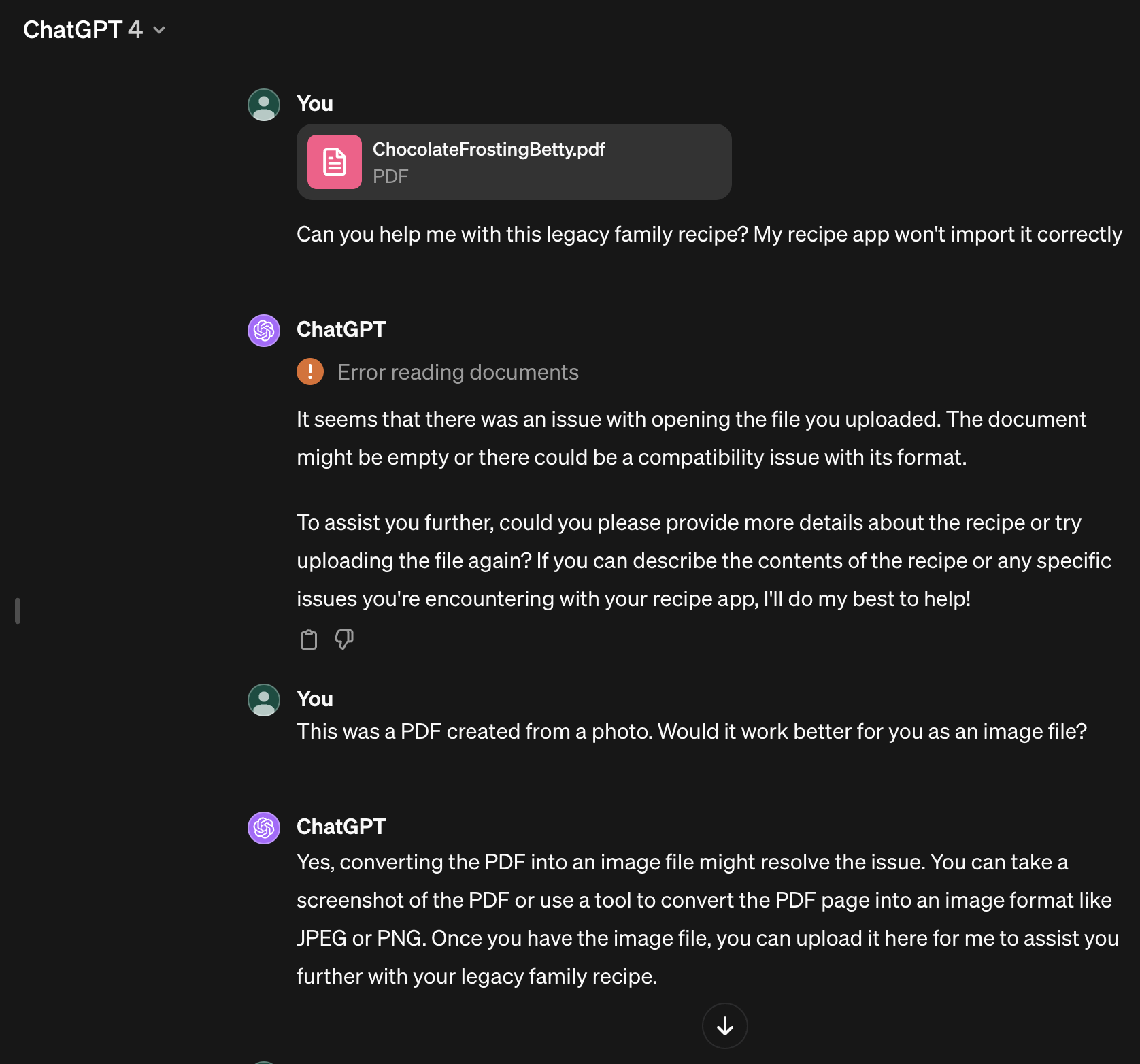 This first request caused GPT-4V to puke—PDFs aren’t considered an image format. I used macOS Preview to export a png file from another one my recipe PDFs and fed that to Vision. This was the input: