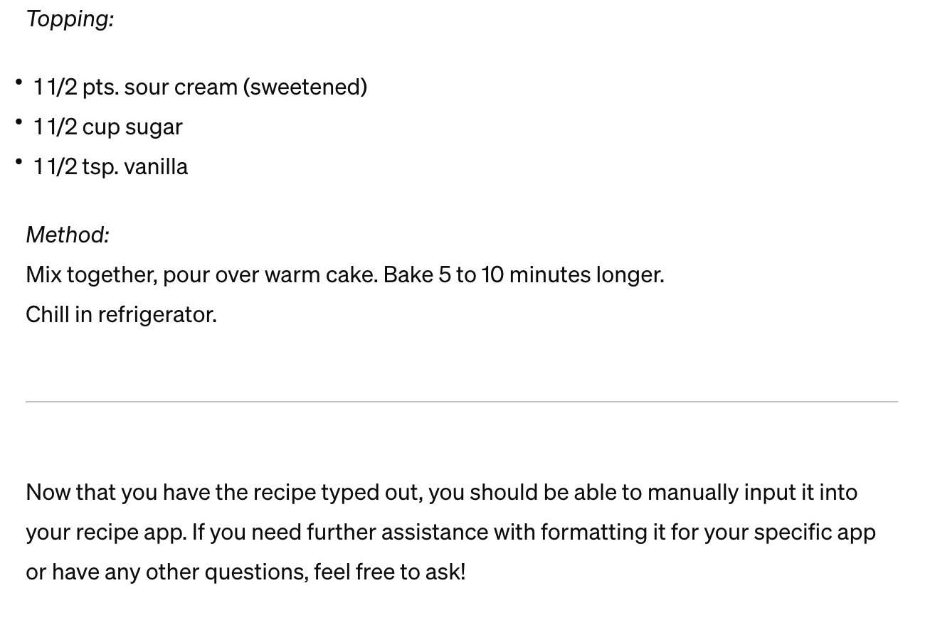 - Shut up and stop making things up: ChatGPT just loves to be helpful and creative. I’m ok with that, carefully controlled, where enrichment is needed, but without lots of guidance, I was losing the original recipe content, and instead getting made-up facts, “family” and “heirloom” seeming to trigger the GPT into fantasy.