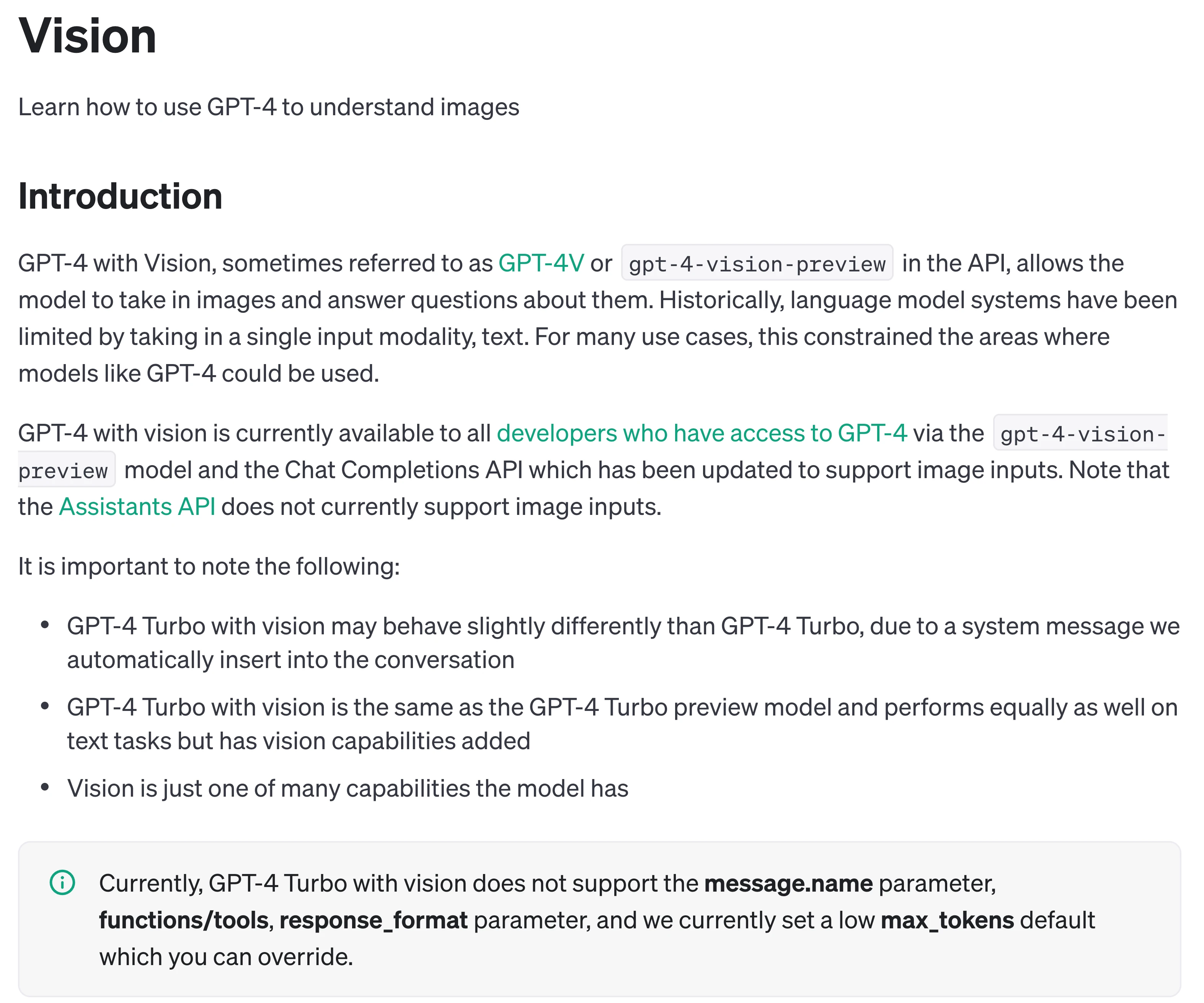 The Chat Completions API, paired with the gpt-4-vision-preview model, is wonderful in its multimodal-ness. Unfortunately, this pairing is significantly restricted compared to the same API paired with the latest gpt-4-turbo-preview model. The even-more-powerful Assistants API currently doesn’t support image input at all.