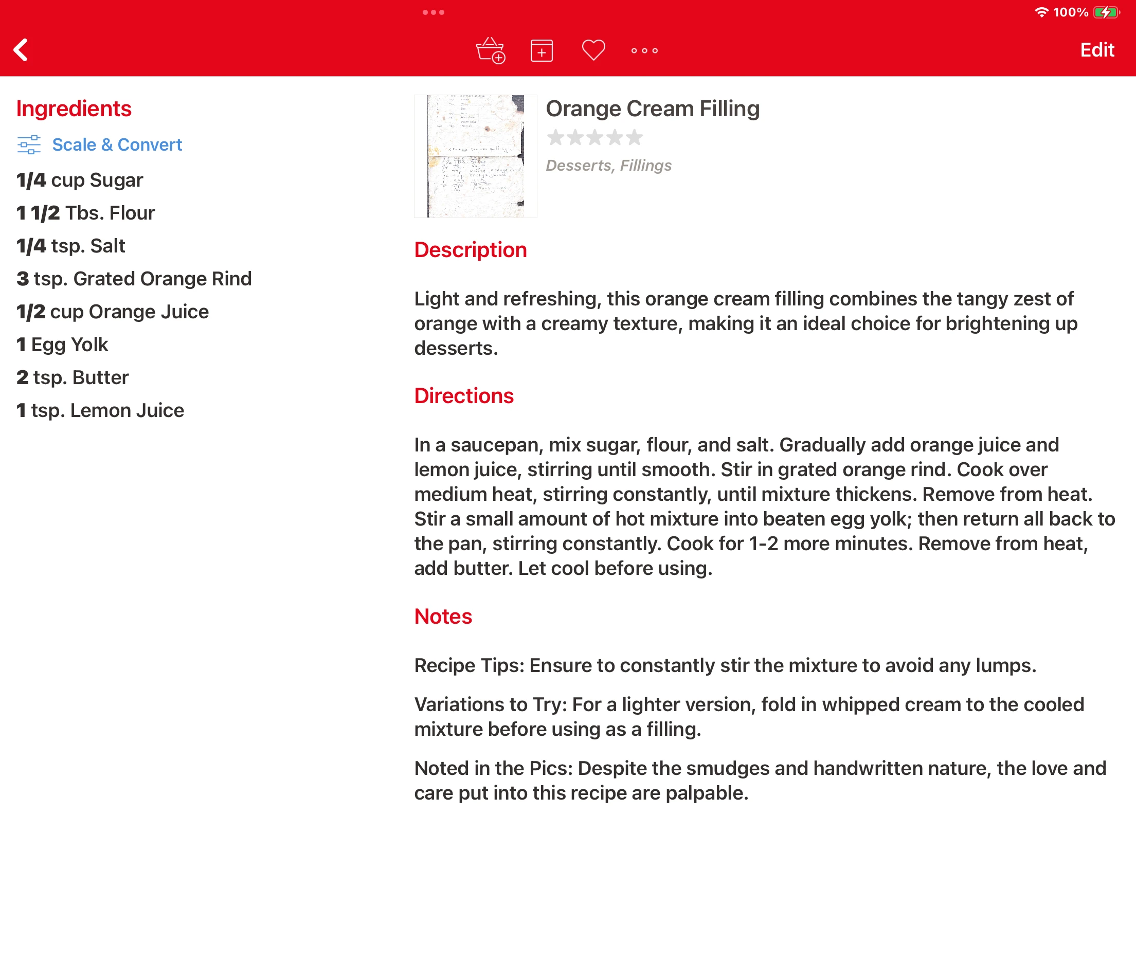 What the family really needs is both a great facsimile of the original paper recipe (high resolution, correct orientation, zoomable), and a fully-digital recipe with all the goodies that apps like Paprika and Recipe Keeper give you—ingredient scaling, store lists, easy sharing, and so on.