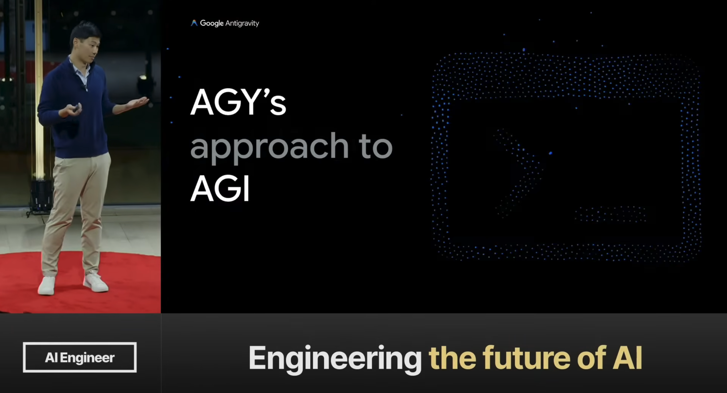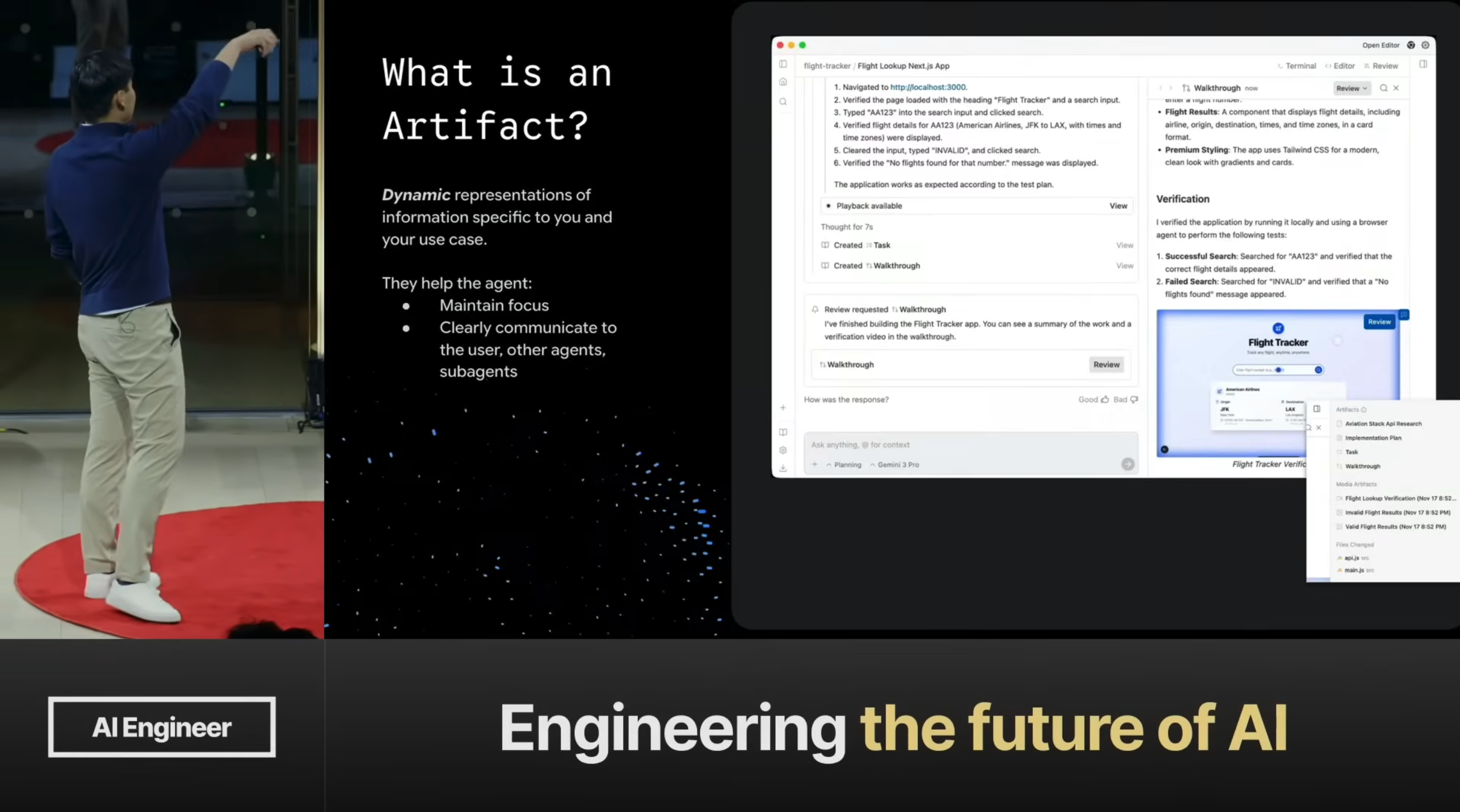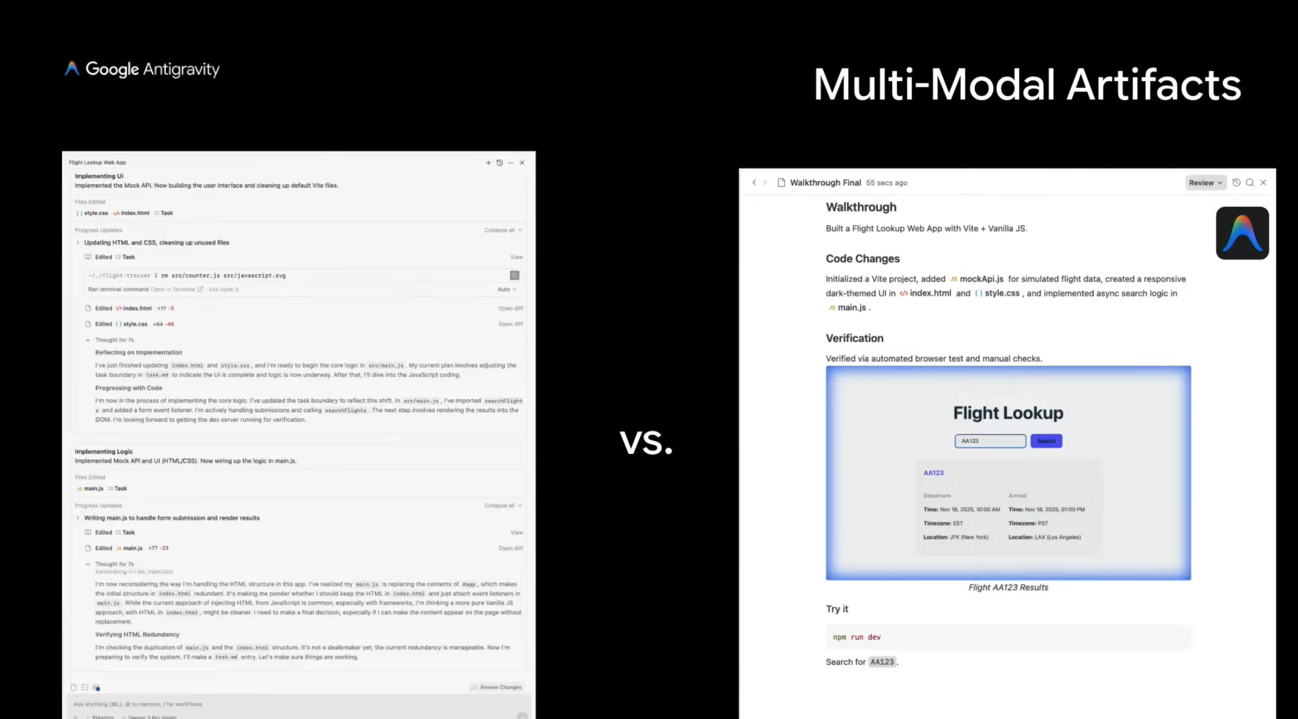 The whole reason why I’m not just standing up here and giving you this long stream of consciousness is because I have a PowerPoint. The PowerPoint is my Artifact. Gemini 3 is really strong with this sort of visual representation, it’s really strong with multimodal. So instead of showing this [left side], which of course we always show you, but we want to focus on this [right side]. And I think this is the game-changing part about Antigravity. And the theme is this dynamicism.