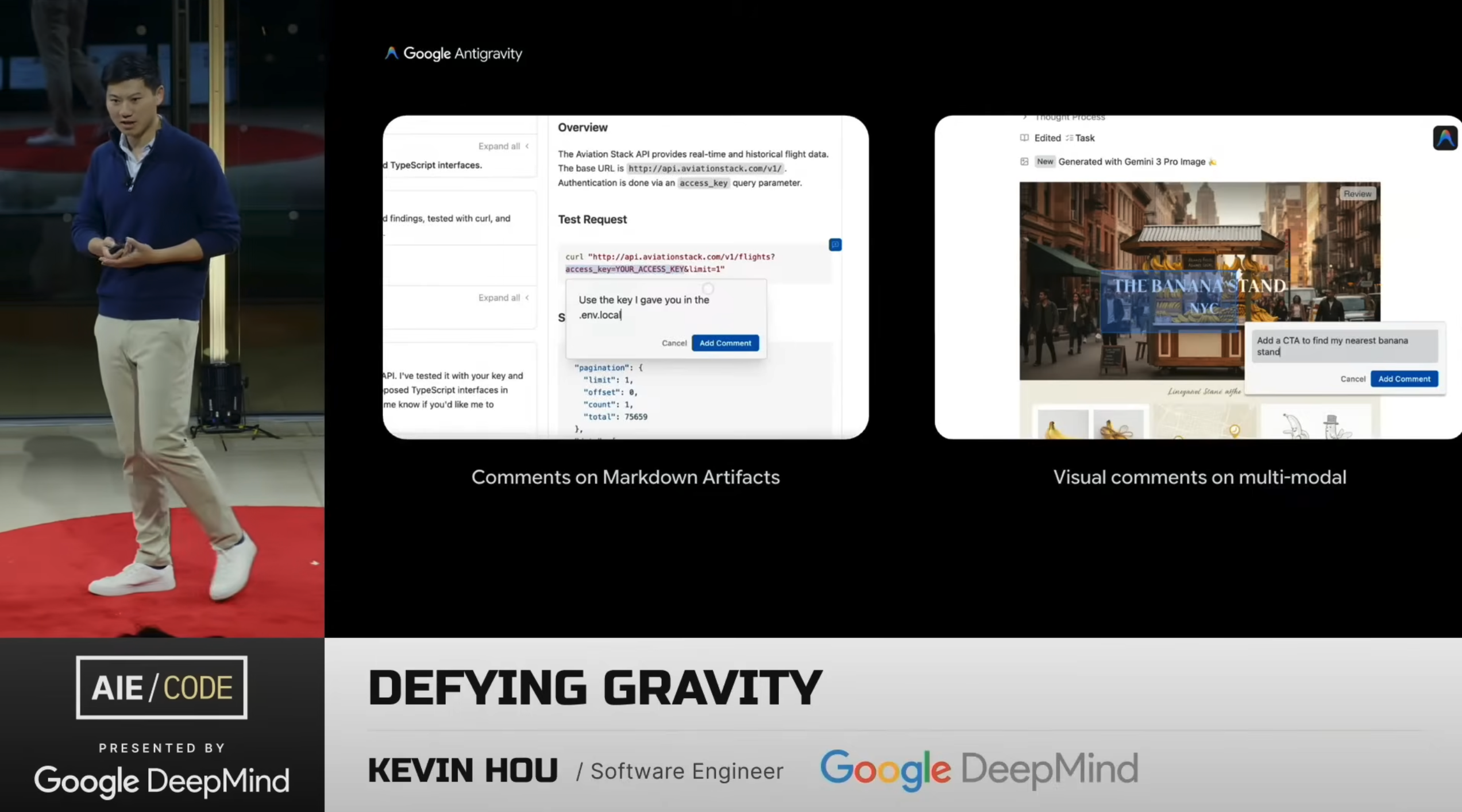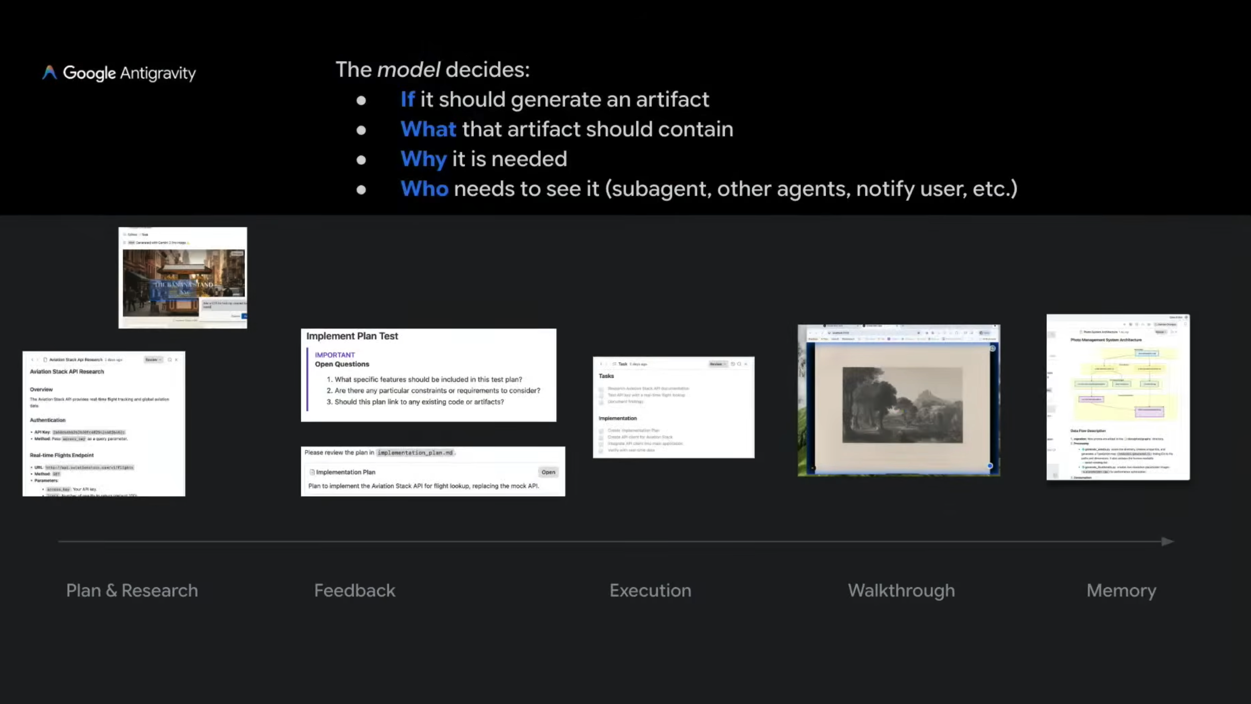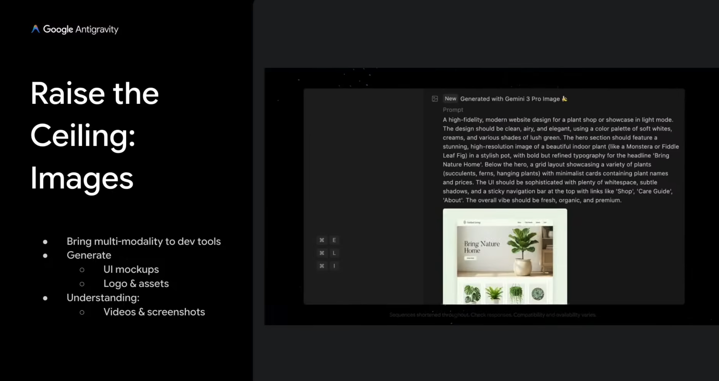 The whole reason why I’m not just standing up here and giving you this long stream of consciousness is because I have a PowerPoint. The PowerPoint is my Artifact. Gemini 3 is really strong with this sort of visual representation, it’s really strong with multimodal. So instead of showing this [left side], which of course we always show you, but we want to focus on this [right side]. And I think this is the game-changing part about Antigravity. And the theme is this dynamicism.