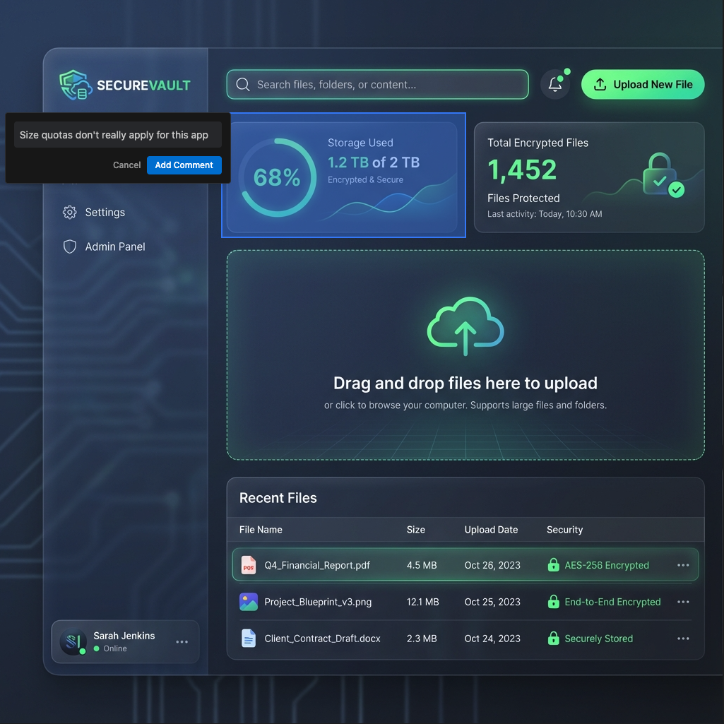 - Quick Stats Cards: 'Storage Used', 'Total Encrypted Files'.