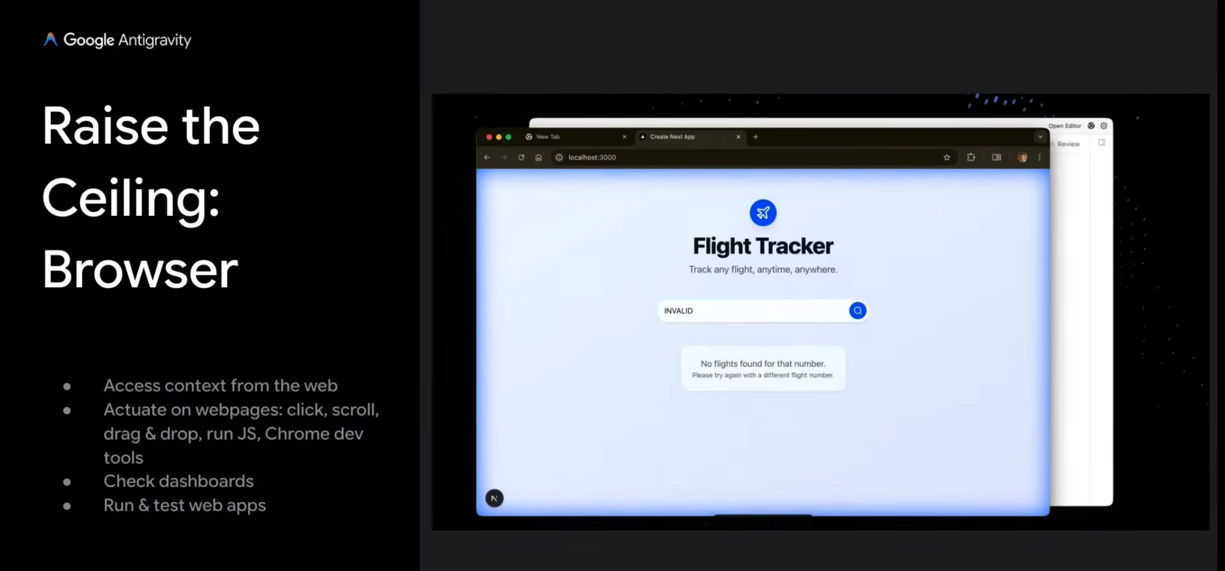 And then finally, something that I love, an agent-controlled browser. This is really, really cool. And hopefully for the folks in the room that have tried Antigravity, you’ve noticed some of the magic that we’ve put in behind here. So we have an agent-controlled Chrome browser. And this gives the agent access to the richness of the web. And I mean that in two ways. The first one, context retrieval, right? It has the same authentication that you would in your normal Chrome. You can give it access to your Google Docs. You can give it access to, you know, your GitHub dashboards and things like that and interact with a browser like you would as an engineer. But also, what you’re seeing on the screen is that it lets you, it lets the agent take control of your browser, click and scroll and run JavaScript and do all the things that you would do to test your apps.