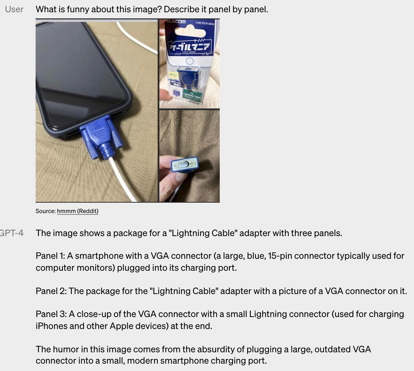 OpenAI demonstrated visual inputs (not yet released), allowing prompts to include interspersed images and text. And this doesn;t just mean it recognizes a picture of a cat and substitutes “cat” on the prompt – GPT-4 “understands” what kind of an image it’s seeing, the context of that image: